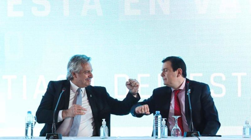 El presidente Alberto Fernández, arribó a la provincia a las 12.45 y fue recibido por el Gobernador de la Provincia Dr. Gerardo Zamora, luego partieron para inaugurar el emprendimiento productivo en Villa Robles.