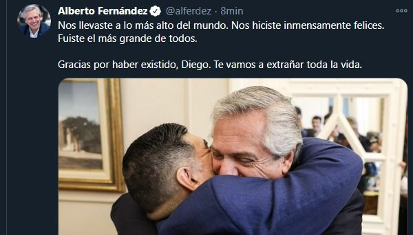 Fernández, sostuvo “Nos llevaste a lo más alto del mundo. Nos hiciste inmensamente felices. Fuiste el más grande de todos”, y agregó “gracias por haber existido, Diego. Te vamos a extrañar toda la vida”, concluyó el mensaje acompañado de una foto en la que el “10” abraza con fuerza al presidente, en la última visita que el DT de Gimnasia y Esgrima de la Plata realizó a la Casa Rosada.