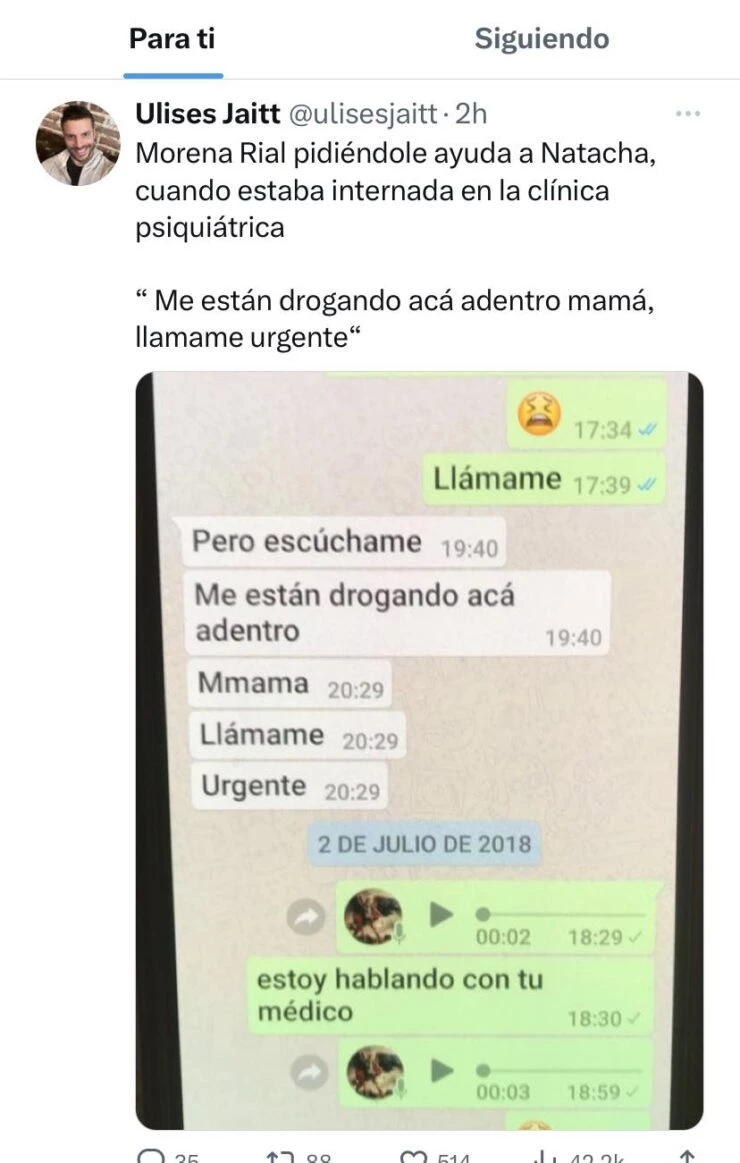 A fin de demostrar que Morena no mentía en sus palabras, el hermano de Natacha publicó en Twitter conversaciones que ambas mantuvieron en ese momento y donde la hija del ex conductor de Intrusos le pedía ayuda a la ex vedette. “Pidiéndole ayuda a Natacha, cuando estaba internada en la clínica psiquiátrica“, escribió el periodista radial..