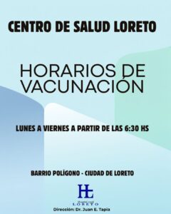 Desde el Centro de Salud Loreto, dependiente del Hospital Zonal Dr. Óscar Ábalos, se informa a la comunidad que el servicio de vacunación se brinda de Lunes a Viernes a partir de las 6:30 de la mañana.